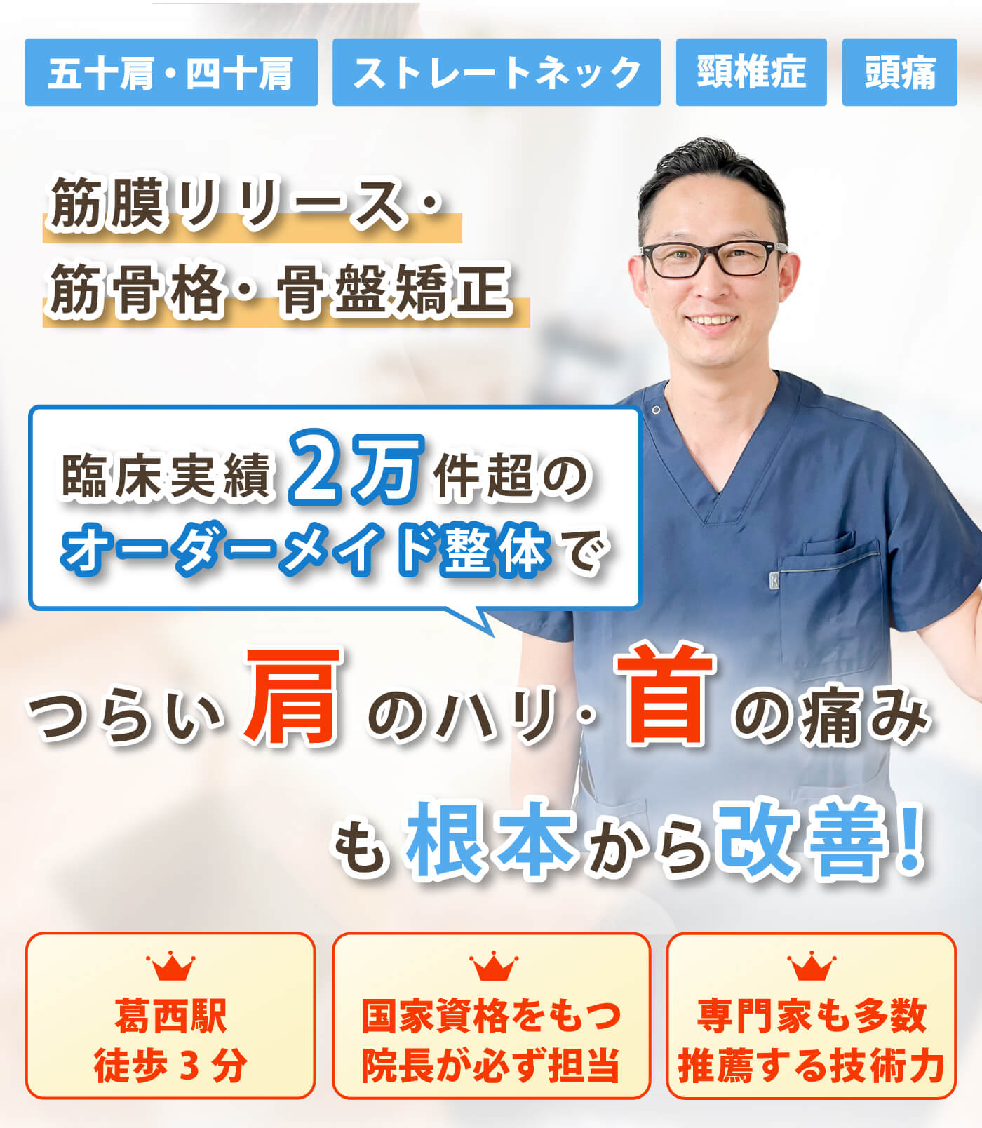 五十肩・四十肩、ストレートネック、頸椎症、頸椎ヘルニア、頭痛など首の痛みや肩こりの施術経験が豊富な整体院です。施術して終わりではなく、その後の自宅でできるセルフストレッチや生活習慣の指導もいたします。